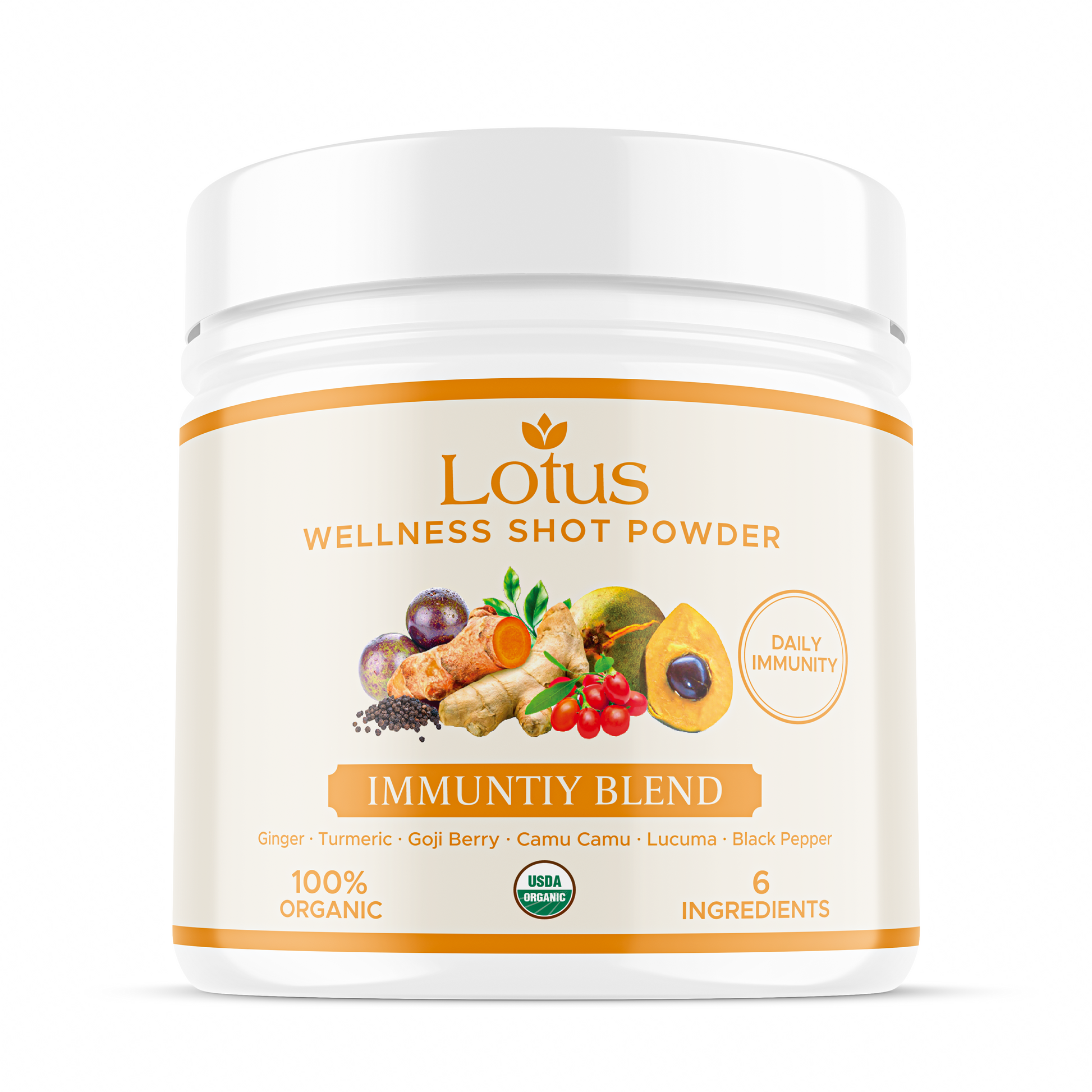 Our wellness shot powder combines Ginger, Turmeric, Camu Camu, Lucuma, Goji Berry, and Black Pepper. 100% organic and free of fillers.